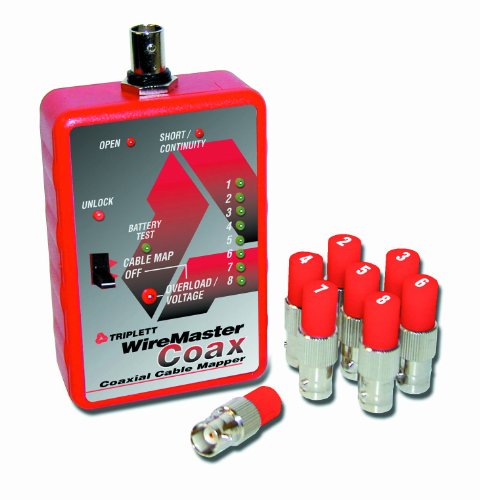 The Triplett Wiremaster Coax is an 8 way Cable Mapper, with built-in Continuity beeper, and 120VAC line cross protection. BNC connectors on the Main Unit and the Remotes allow the user to attach to BNC cables or outlets, and due to the variety of off-the-shelf BNC adapters, to numerous other connector families. Specifications: Identifies 8 individual remotes by measuring their precision resistance. AC and DC test detects voltages above 3 volts. Display: Bright Red and Green LEDs indicate the test results. Protected against damage up to 120 volts AC/DC (no fuse required). Minimum cable length: no minimum. Maximum cable length: any length whose total DC resistance is less than 200 Ohms. Cables / Wires Tested: Any pair whose total DC resistance is less than 200 Ohms, and is unconnected to other equipment or circuitry. Continuity: Continuity (SHORT) is indicated for resistances of 500 Ohms or less. OPEN Test: OPEN is indicated for resistances of 10,000 Ohms or more. Battery: 9 volt. Battery Life: approx 20 hours continuous use (alkaline battery). Size: Main Unit: 2.45" W x 4.5" H (to top of BNC) x 1.25" T (to top of switch). Remote: 0.5" W x 1.25" H. Weight: Main Unit (with battery): 4.6 oz. Complete Kit: 11.8 oz. Note: The WireMaster Coax will not map cables if any of the following devices are in use: Amplifiers, electronic switches, attenuators, matching transformers, baluns, modulators, dc blockers, power dividers, directional taps, splitters (non power passive).Triplett 3274 WireMaster Coax 8-Way Coaxial Cable Mapper Ratings & Customer Reviews